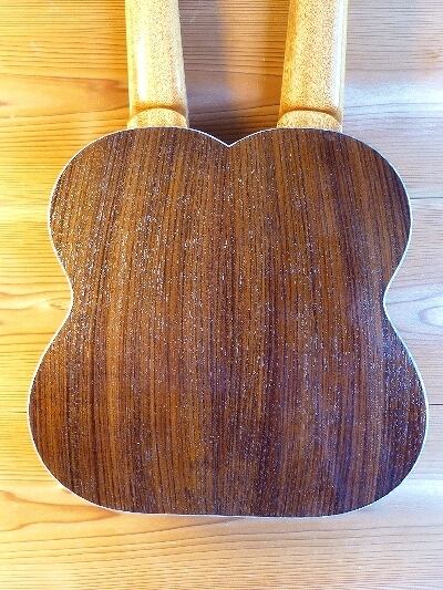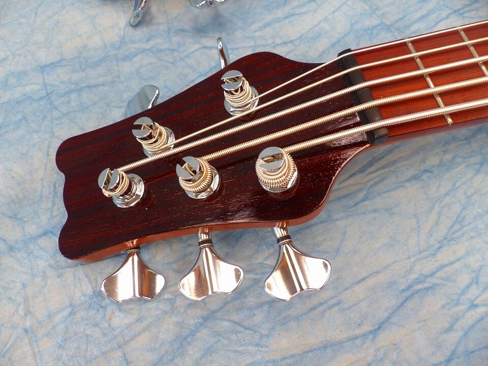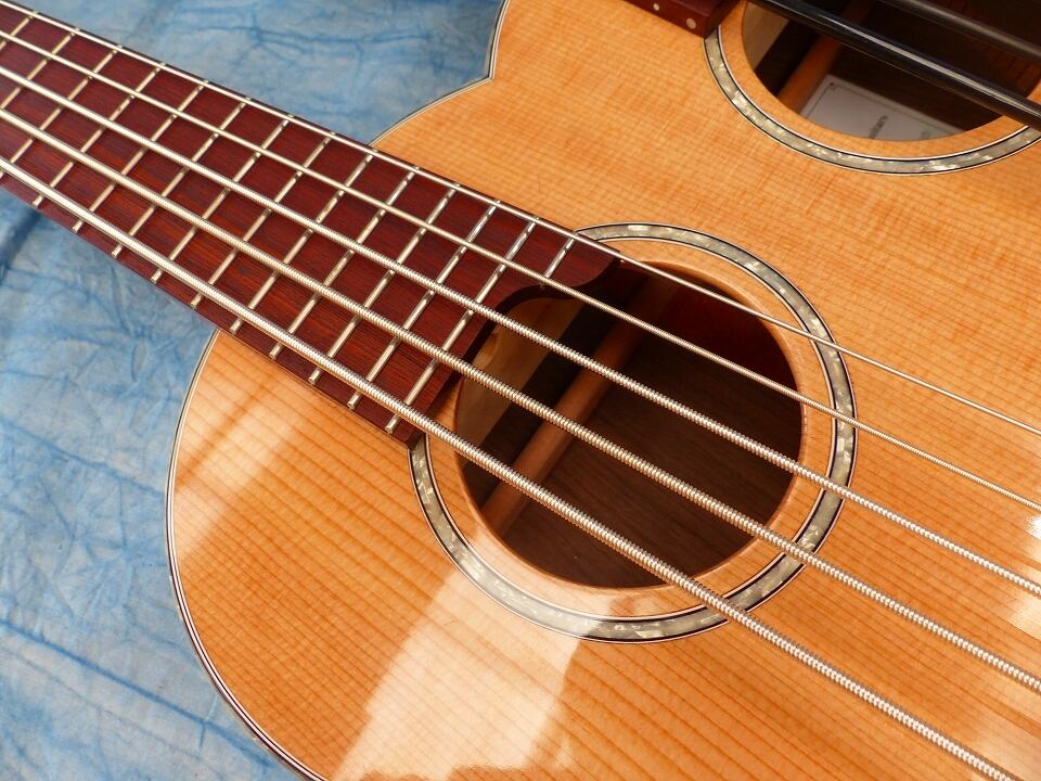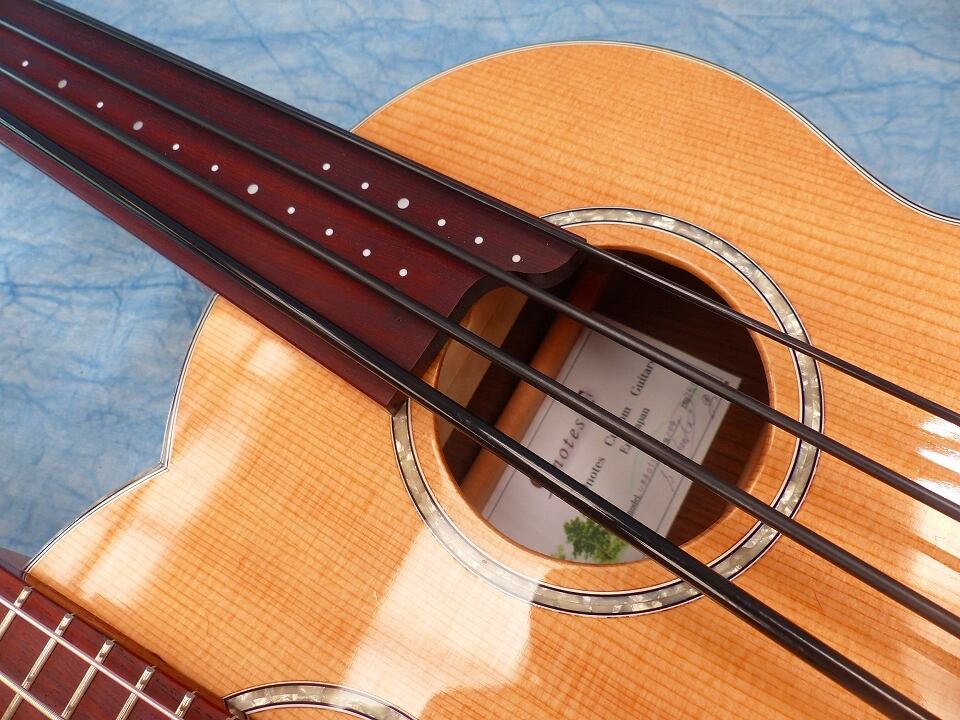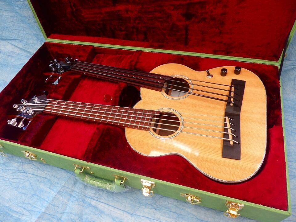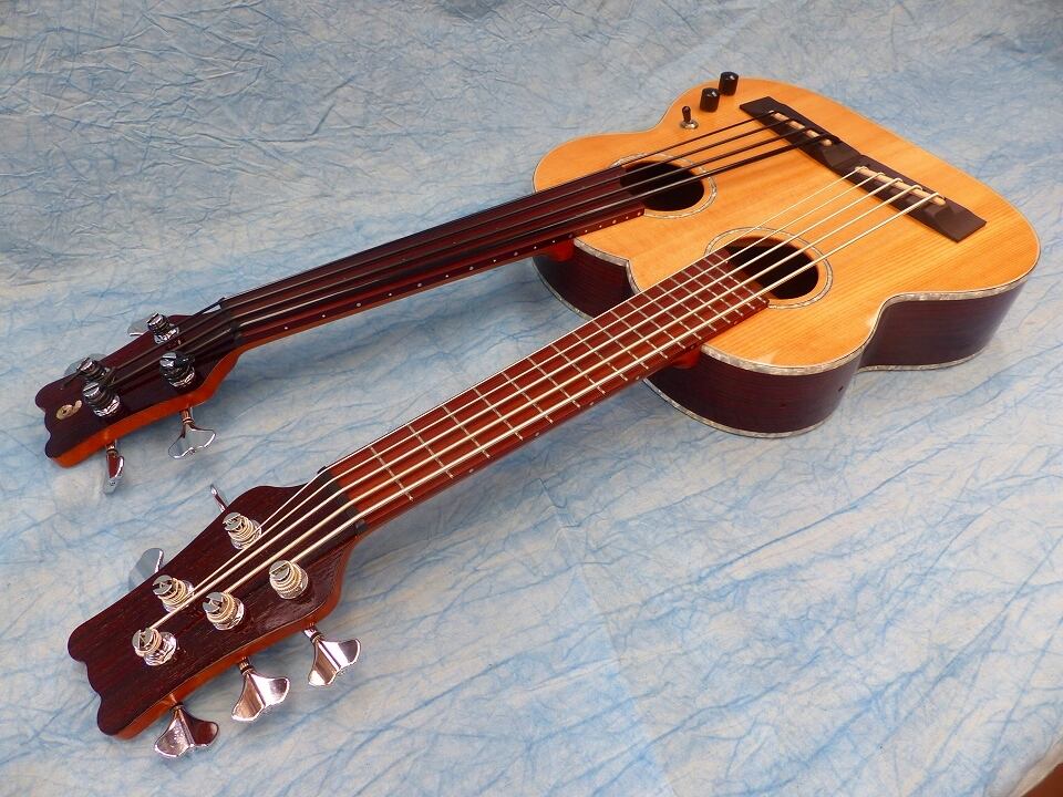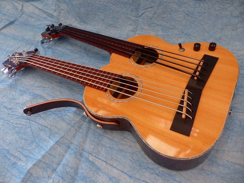 5弦スティールと4弦フレットレスのWネックウクレレベースです。この組み合わせが一番ウクレレベースの特徴を生かせると思い製作しました。昨今KALAからウクレレベース弦用のスティール弦が発売されて高評価(それの5弦バージョン)です。ポリウレタン弦(Aquila)+フレットレス指板ではウッディなサウンドを再現できます。その両方を1台で備え持つこの楽器は最強でオンリーワンです。