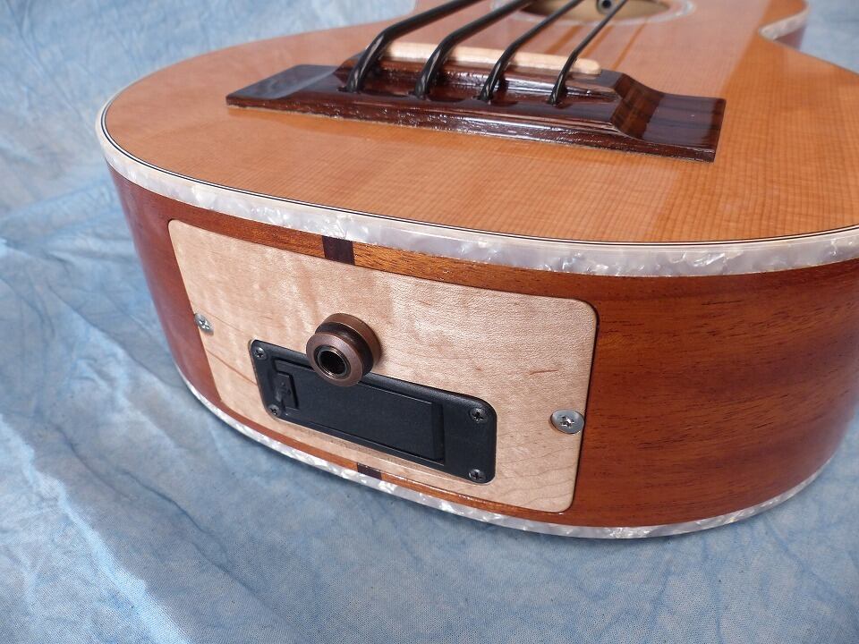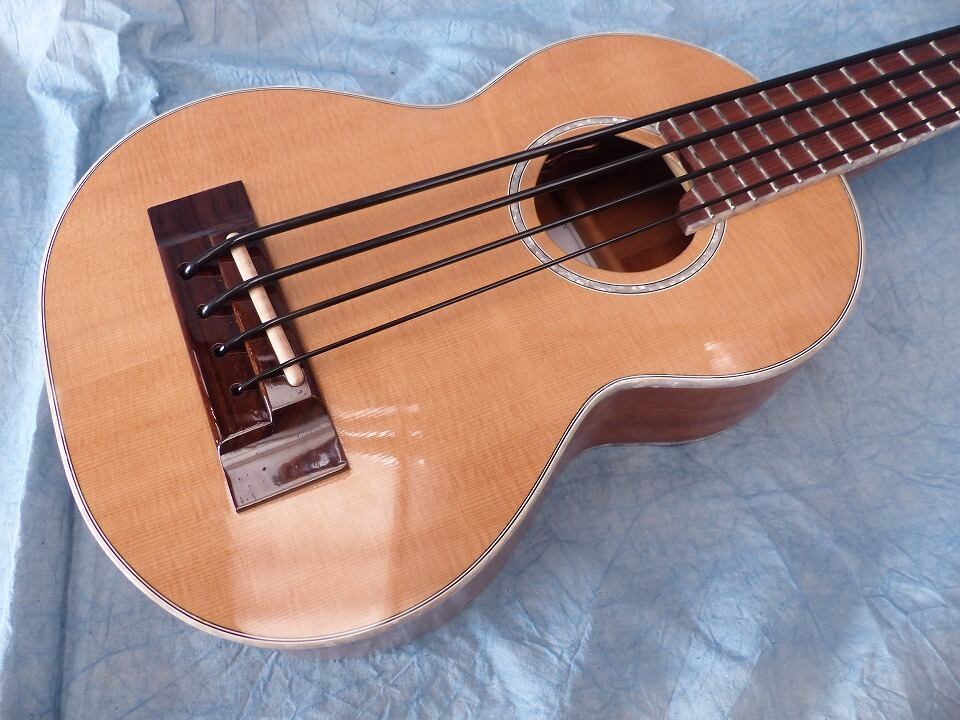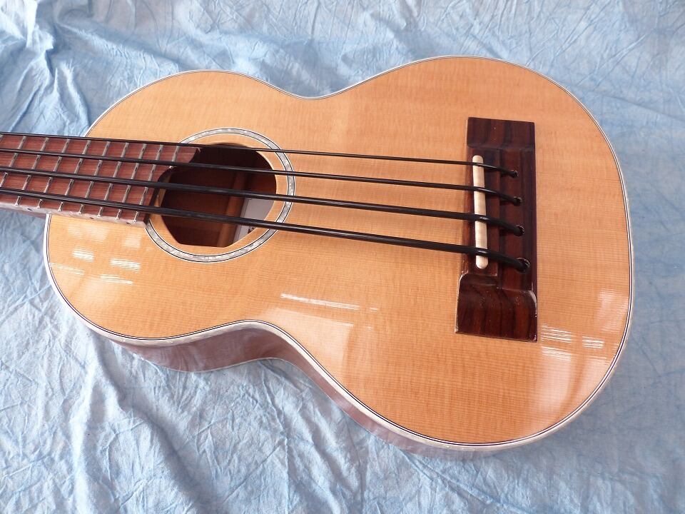 ウクレレベースの開発を始めた当初にプロトタイプとして貸し出したモノが帰って来ました。それを再調整したので特価で販売したいと思います。オール単板ウクレレベース”。