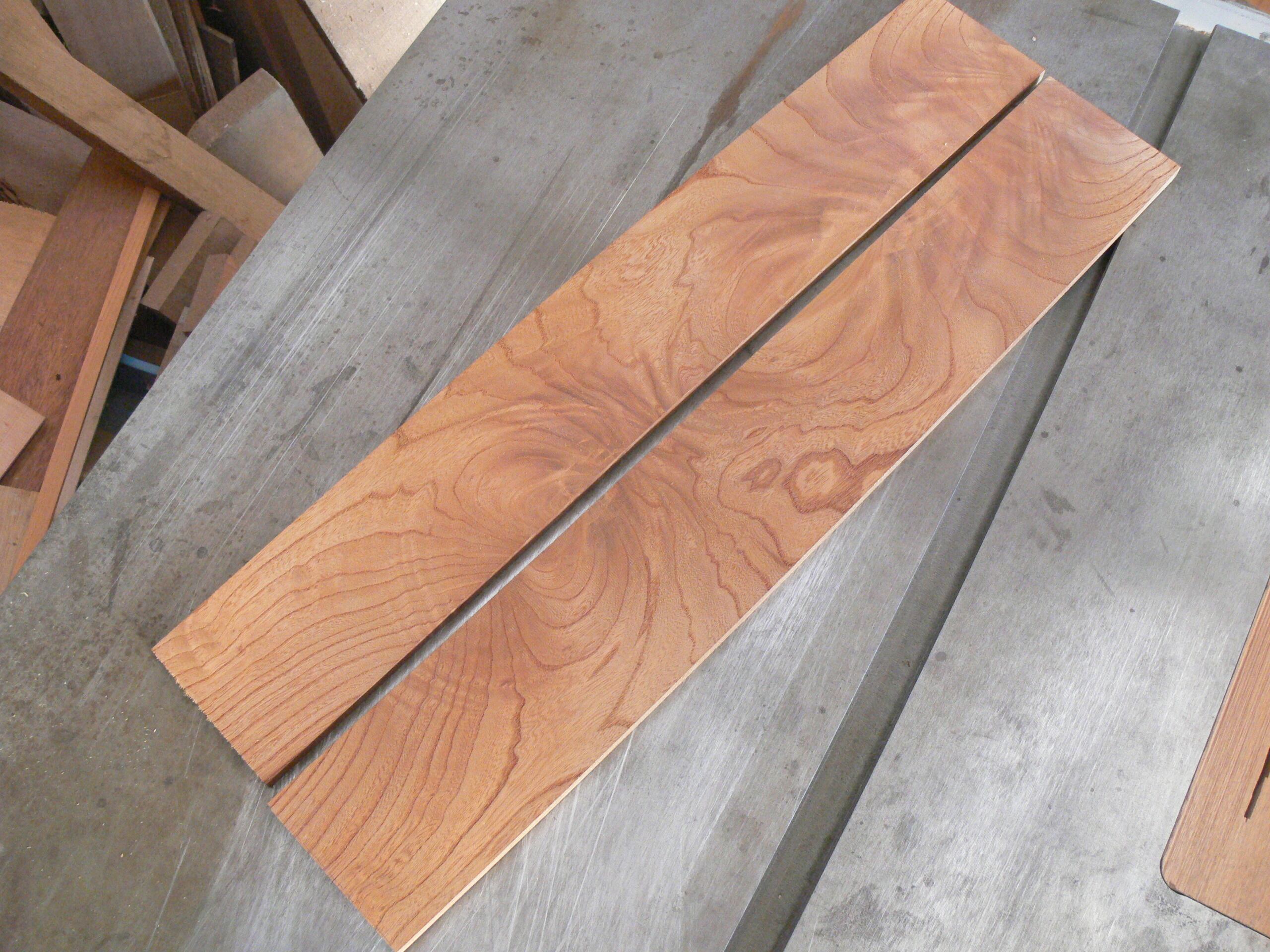 ”スモークド乾燥”処理済み『欅・板目・杢』A: 500×80×8(㎜)(ひとつの材を二つに割ったのでブックマッチで2枚取れました)